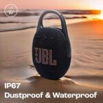 - Waterproof and dustproof : The JBL Clip 5’s IP67 waterproof and dustproof rating ensures this portable speaker can handle almost any environment, from a poolside party to a seaside picnic