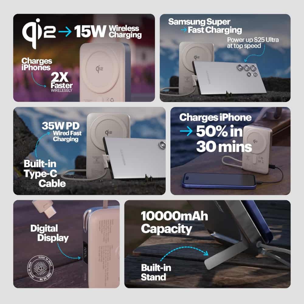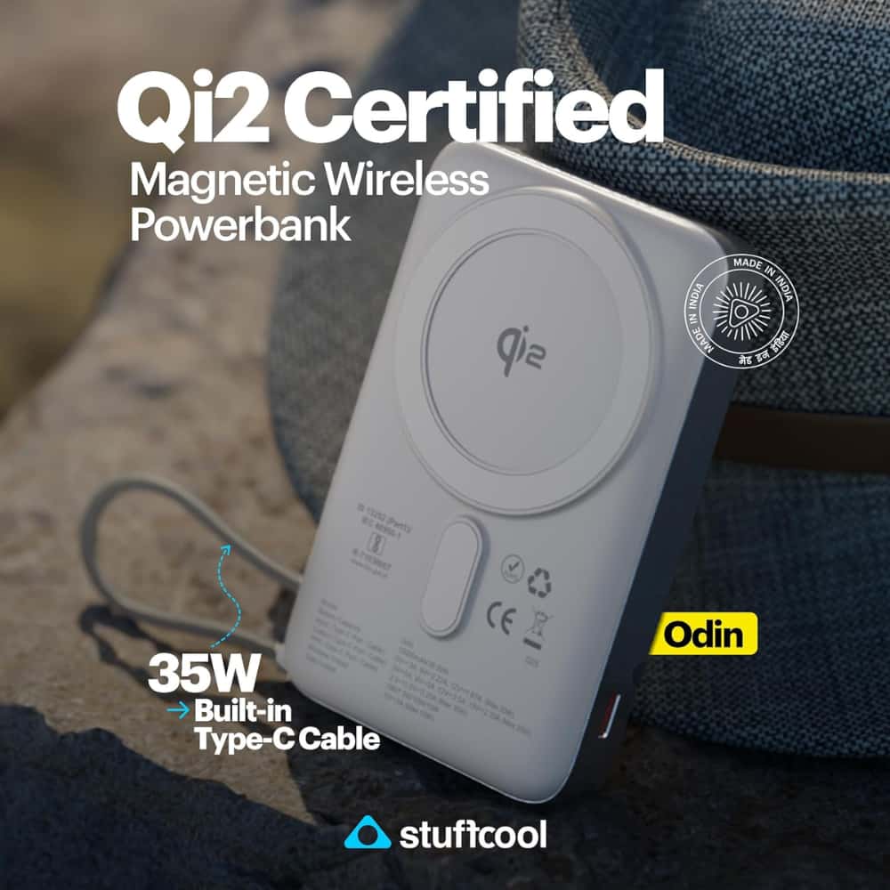 The God Father of Magsafe Powerbanks]:Meet Odin, the Qi2-certified MagSafe power bank delivering 15W fast wireless charging for iPhone, 35W PD wired charging, and wireless fast charging for Samsung devices. With 10,000mAh capacity, a built-in Type-C cable, sturdy stand, and digital display, it keeps everything powered in a compact, Made-in-India design.